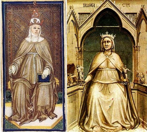 Figure 37, left, PMB Popess card, 1450s Milan. Figure 38, right, Giotto, fresco of Justice, Padua c. 1305.